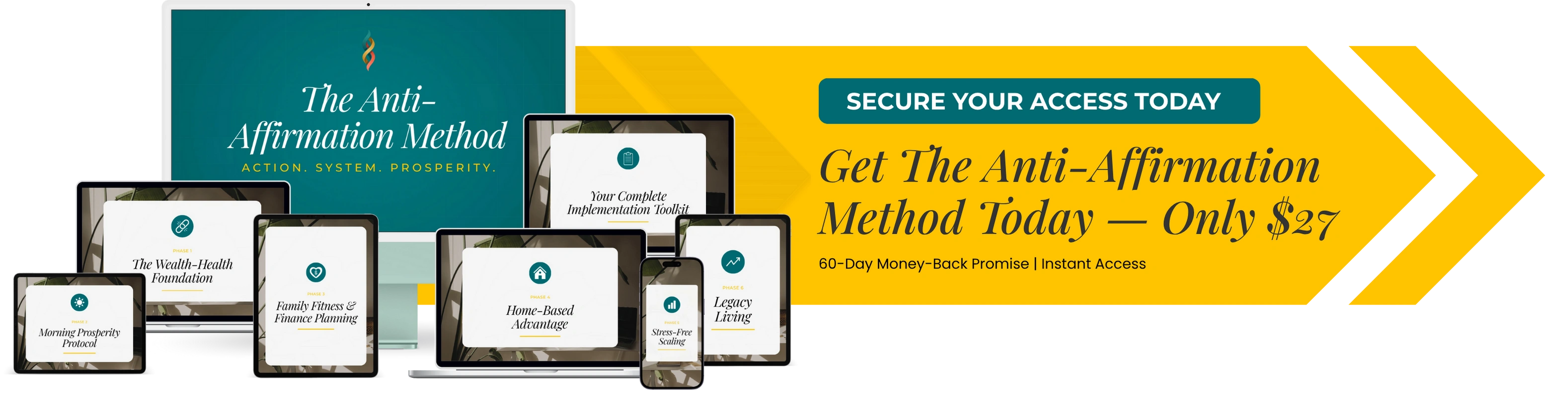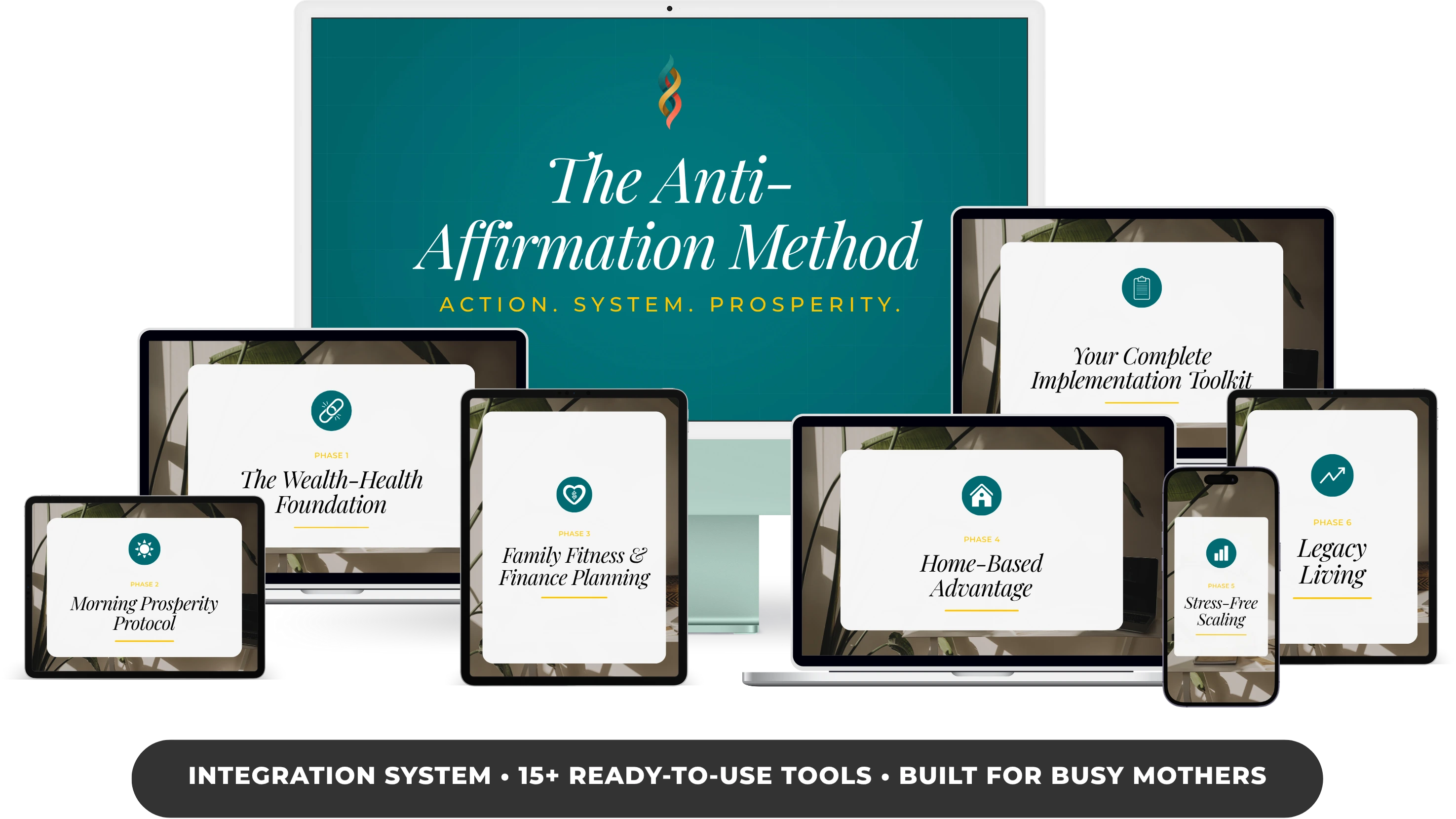 A: Most programs treat family, health, and wealth as separate priorities you need to "balance." The Anti-Affirmation Method is built on integration—where these three areas actually strengthen each other. Instead of choosing between priorities, you create compound prosperity where every action serves multiple goals. Plus, there are no empty affirmations—just practical, research-backed systems.